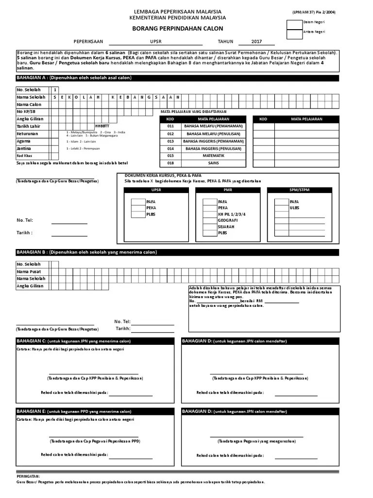 Panduan pengurusan peperiksaan bahagian a by norsuriana hussin issuu. Tarikh pertukaran yang dikehendaki : Borang perpindahan calon lpm am37 pin 2 2004 pdf free download. Adalah disahkan bahawa pelajar ini telah mendaftar di. Borang perpindahan calon upsr, pmr, spm, stam. Pdf borang pertukaran keluar negeri abd rahim osman academia edu.
